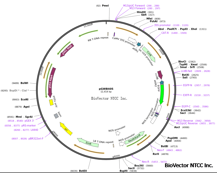 pGWB405植物绿色荧光表达载体gateway技术兼容,35S启动子,C端sGFP融合绿色荧光标签。Cm和Sp抗性,Kan植物筛选标记。