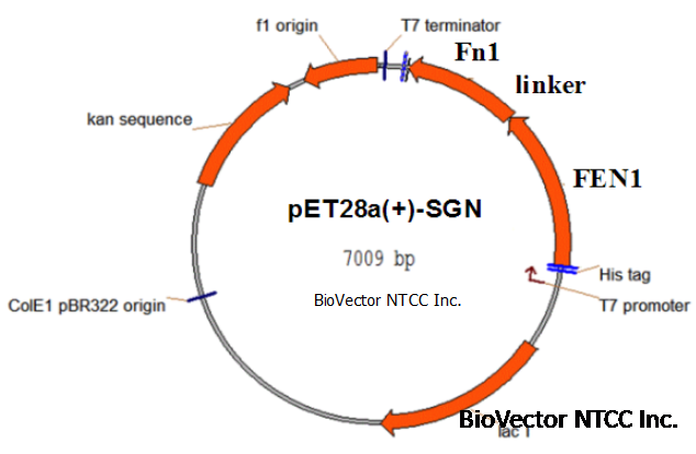 pET28a-SGN基因编辑质粒结构引导的核酸内切酶技术SGN(structure-guided endonuclease),SGN不受靶标序列限制。SGN中包含识别3’flap结构的内切酶FEN-1(flapendonuclease-1)和能够切割DNA链的Fok I (Fn1) 的切割结构域,人工合成的引导DNA(guide DNA)能够和靶标序列形成3flap结构,该结构被SGN识别并结合后,SGN就可以对任何想要进行编辑的靶标DNA进行剪辑。