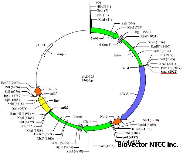pAHC25植物表达载体,Ubi启动子,Bar抗除草剂基因筛选标记。