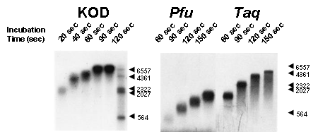 ![]() Fig. 4. Comparison of elongation rates of KOD Pfu and Taq DNA polymerase. The elongation rate was measured according to the length of synthesized DNA, using M13 ssDNA as the template at 75ºC. | ||||||||||||||||||||||||||||||||||||||||||||||||