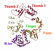 In parallel with the study of the activities of KOD DNA polymerase, neutralization antibodies for the polymerase and proofreading activities were developed (2). These antibodies can be applied to the "hot start PCR technology" using KOD DNA polymerase. The 3-D structure of DNA polymerase was characterized in 2003 (Fig. 5) (3). | ![]() Fig. 5. 3-D structure of KOD DNA polymerase J. Mol. Biol., 306: 469-477 (2001) | |||||||||||||||||||||||||||||||||||||||||||||||