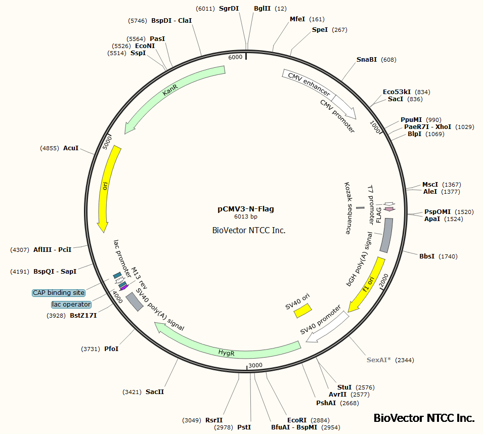 pCMV3-N-Flag真核表达载体,CMV启动子,N端带有Flag标签,Hygro潮霉素筛选标记。