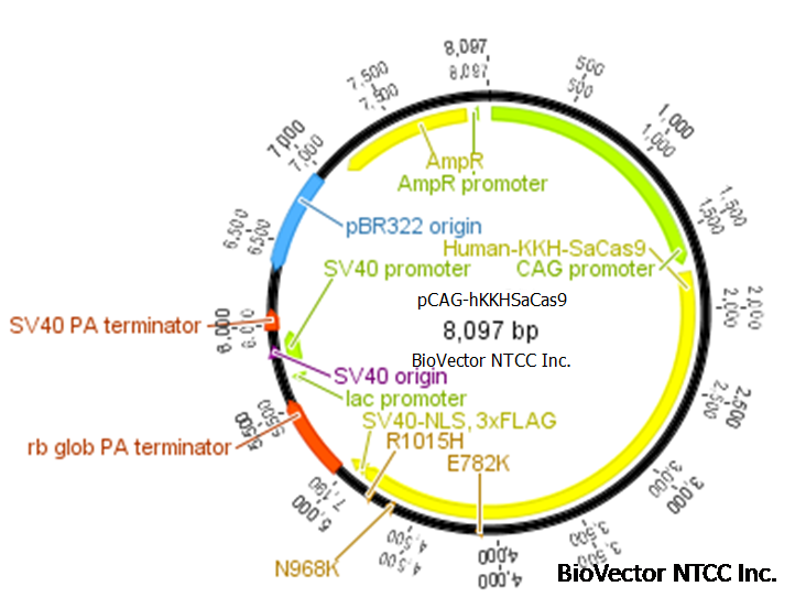 pCAG-hKKHSaCas9哺乳动物细胞表达突变型SaCas9质粒,CAG启动子,NLS核定位信号,3xFlag标签,SaCas9带有E782K,N968,R1015H三突变位点,扩大了PAM靶点范围.