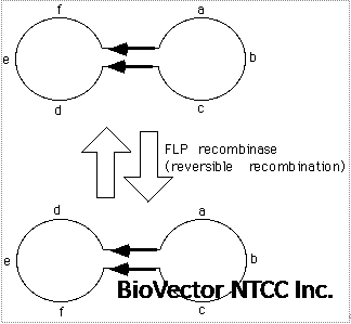 To solve this problem, the 2u circle has a site-directed inversion mechanism that allows plasmid amplification. The 2u circle has two copies of a 599 bp inverted repeat sequence (called "flip" sites) and encodes a site-directed recombinase called FLP (the "flip" protein) that promotes recombination between these repeats. Recombination between the flip sequences inverts the adjacent regions of the plasmid as shown in the figure below. (The inversion is easier to visualize if you draw a crossover between the inverted repeats indicated by the arrows and follow the DNA strands with your pencil.)