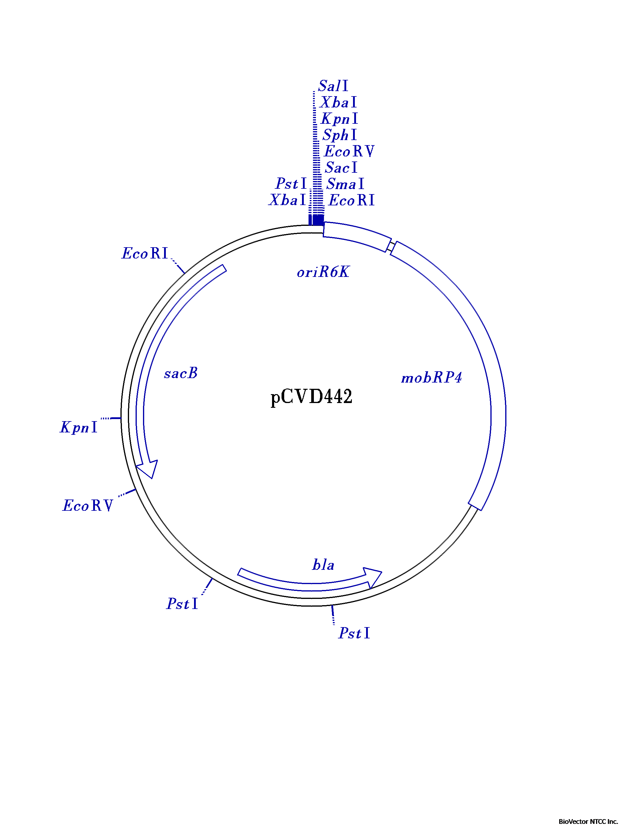 This suicide vector was created to engineer mutations in host strains via allelic exchange. The important properties of this vector are: 1) a pir dependent origin of replication from plasmid R6K, 2) the bla gene encoding resistance to ampicillin, 3) the mob region allowing efficient transfer by conjugation from strains containing the tra locus, and 4) the sacB gene conferring sensitivity to sucrose in Gram-negative bacteria. Plasmid pCVD442 was created by cloning the sacB gene on a PstI fragment from plasmid pUM24 (Ried and Collmer. Gene 57:239-46, 1987) into plasmid pGP704 (Miller and Mekalanos. J.Bacteriol. 170:2575-83, 1988) that had been partially digested with PstI. Plasmid pCVD442 and its derivatives can only grow in strains that have the pir gene encoding the Pi protein, which is necessary for replication of R6K plasmids. The pir gene is usually supplied by a lambda lysogen. Such strains include DH5alpha-lambdapir, SY327-lambdapir, SM10-lambdapir, and S17-lambdapir. The last two strains supply the tra genes for efficient conjugation.Sucrose sensitivity is far from absolute. The strain carrying the plasmid grows well on sucrose plates. To detect sucrose sensitivity make serial dilutions of the bacteria and plate both on plates containing and lacking 5% sucrose. There should be substantially fewer colonies and the colonies are smaller on the sucrose plates.