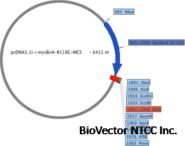 - PURPOSETo fuse your protein of interest to the C-terminus of BirA(R118G) and use in proximity-dependent biotin identification (BioID); myc tag