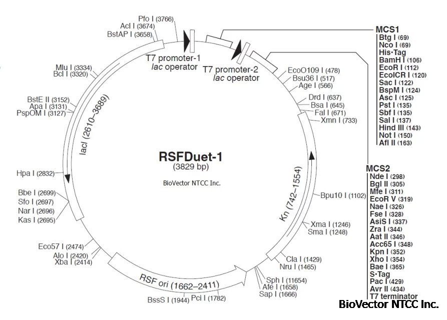 pRSFDuet-1原核双基因共表达载体质粒,Kan抗性,双T7lac启动子,双MCS多克隆位点区,此载体可以与pACYCDuet-1, pCDFDuet-1, pETDuet-1等原核表达载体兼容共转表达,带有RSF复制子。BioVector NTCC质粒载体菌种细胞基因保藏中心提供