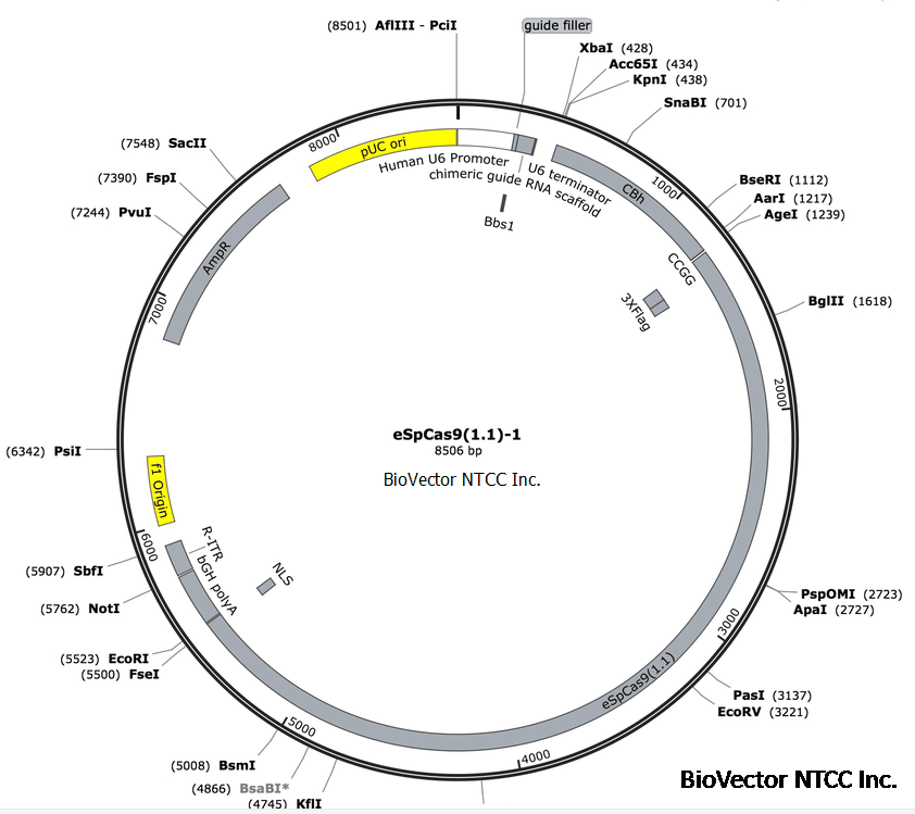eSpCas9(1.1)防脱靶CRISPR-Cas9质粒载体,高精确性精准靶向,三位点突变Mutation K848A, K1003A, & R1060A,CBh启动子,3xFlag标签。Expresses high specificity SpCas9. Px330-like plasmid. BioVector NTCC质粒载体菌种细胞基因保藏中心提供