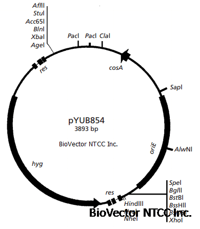 Cosmid pYUB854 is a derivative of pYUB572, in which the bla gene was removed by digestion with BspHI and replaced with a res–hyg–res gene cassette flanked by multiple cloning sites (MCSs).
