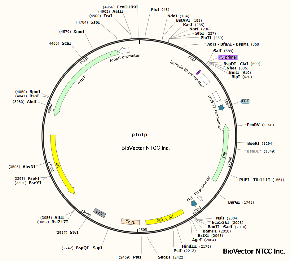 pTnTp转座子Tn7型自杀质粒载体,带有R6K型suicide origin,Amp和Tp抗性。