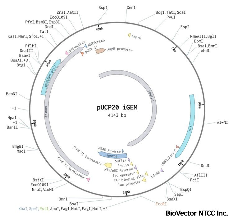 Vector backbone pUCP20Backbone size w/o insert (bp)3643Vector typeBacterial ExpressionGrowth in BacteriaBacterial Resistance(s)Ampicillin, 100 μg/mLGrowth Temperature37°CGrowth Strain(s)DH5alphaCopy numberHigh Copy