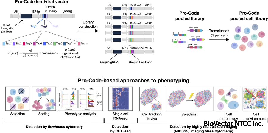 Kit 1000000177: Pro-Code Vector Kit This collection contains a set of 120 lentiviral vector plasmids. Each plasmid encodes a unique protein barcode (Pro-Code), which can be identified on cells by staining with a cocktail of just 10 antibodies. Each Pro-Code is comprised of a mutant version of the human NGFR gene (dNGFR) fused to a sequence encoding three different linear epitopes. The Pro-Code is expressed from the human EF1alpha promoter. The lentiviral vector also contains the U6 promoter and a unique cloning site for insertion of a CRISPR guide RNA. The Pro-Code vectors can be used to carry out pooled CRISPR screens in which 120 different CRISPR-carrying cell populations can be resolved by staining cells with a 10 antibody cocktail and performing single cell flow cytometry, mass cytometry, or by multiplex imaging. The Pro-Code vectors can also be used for tracking cell clones or cell populations.