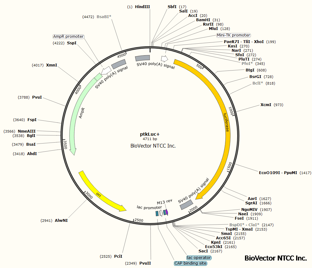 ptkLUC+萤火虫荧光素酶载体含有herpes virusthymidine kinase promoter -BioVector NTCC质粒载体菌种细胞基因保藏中心