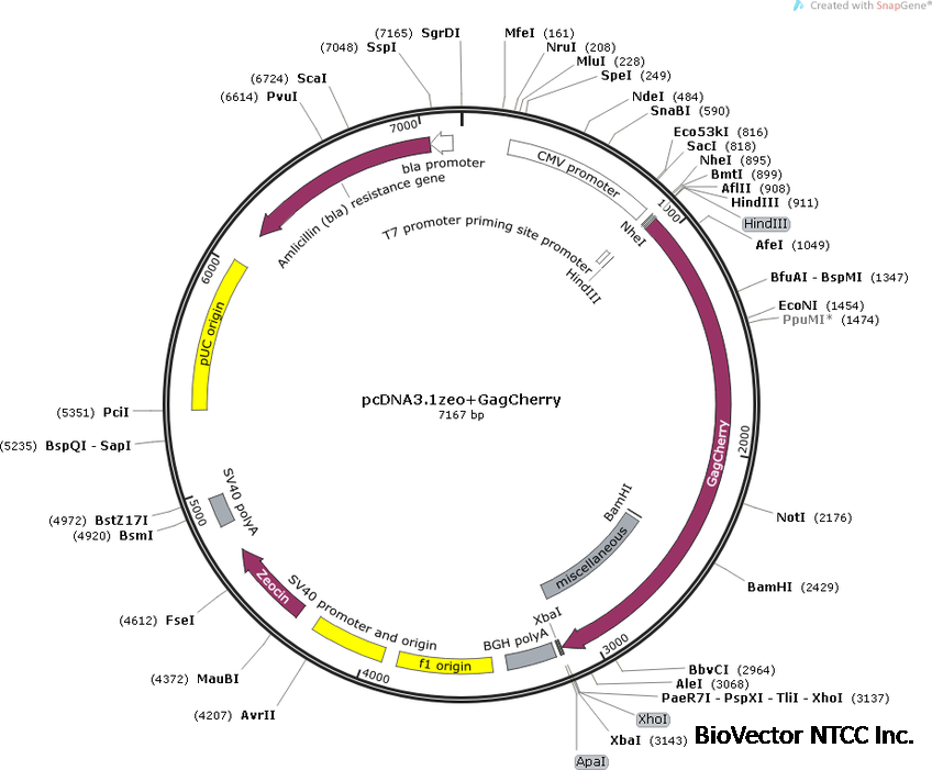HIV-1 Gag-mCherry荧光表达质粒pcDNA3.1/Zeo (+),85390-BioVector NTCC质粒载体菌种细胞蛋白抗体基因保藏中心