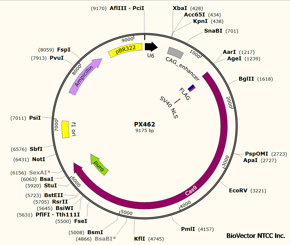 | 载体名称: | PX462;pSpCas9n(BB)-T2A-Puro |