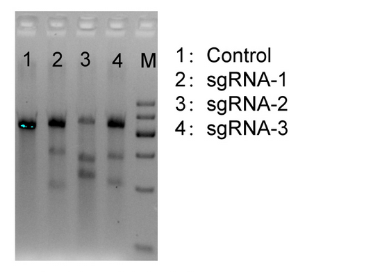 sgRNA 活性高低直接影响后续实验成本。我们提供从sgRNA活性一站式解决方案: 1. 设计sgRNA 序列:根据指定序列,灵活设计sgRNA序列,构建表达载体; 2. 采用T7 或者高通量测序方法进行sgRNA 活性筛选 研究示例: 三条sgRNA 中sgRNA-2 活性最高。